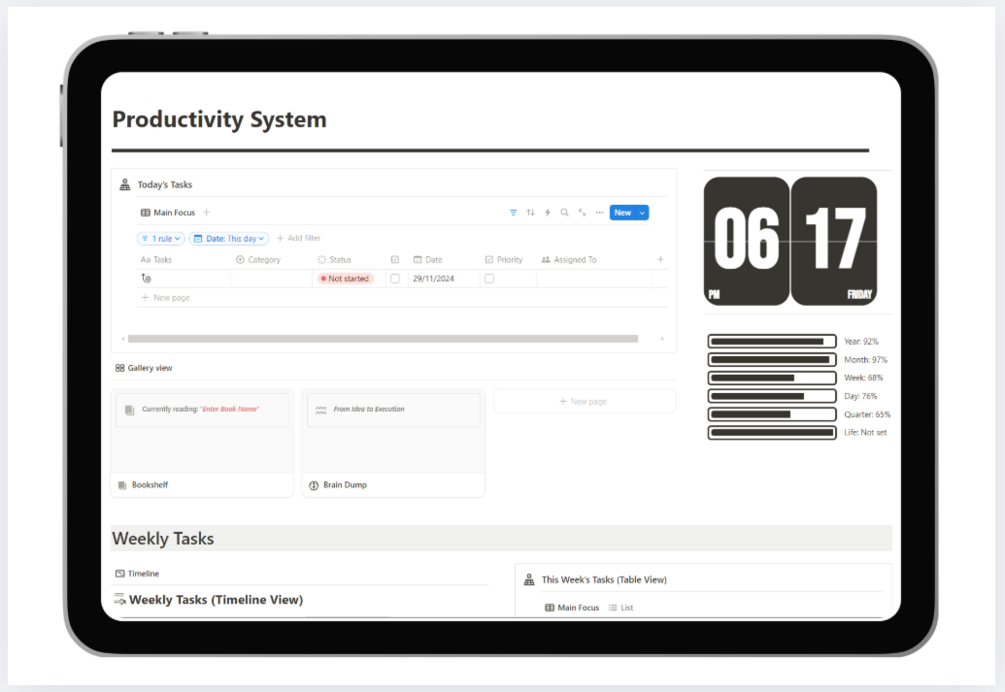Boost your efficiency, stay organized, and achieve your goals with this Productivity System Template! Designed to help you manage tasks, projects, and priorities seamlessly, this all-in-one system keeps your personal and professional life in perfect harmony.